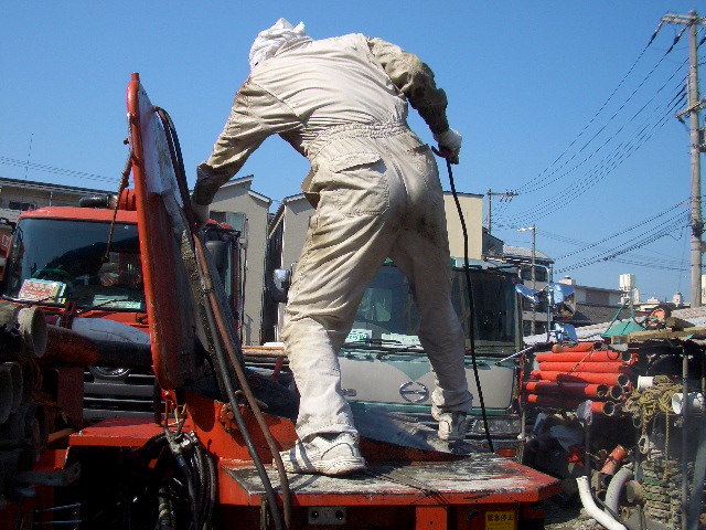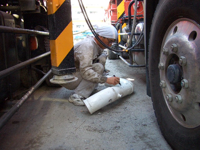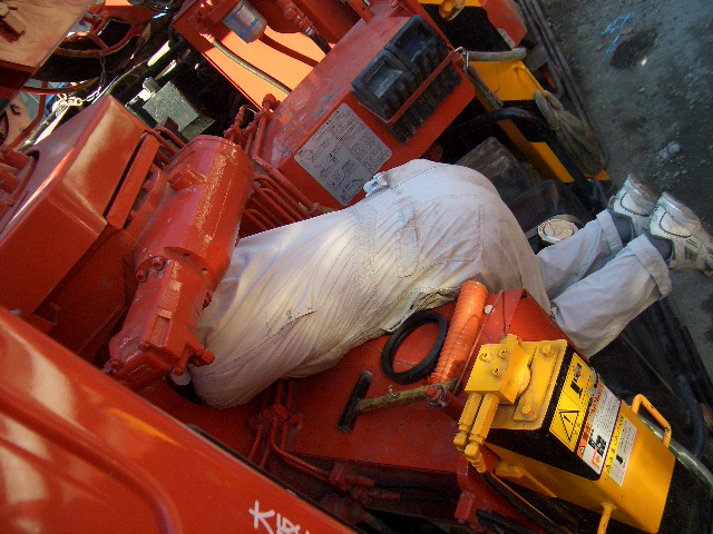 近寄りがたい空気で、大きな車の小さな部分で四苦八苦しながらお仕事してるダーリン
